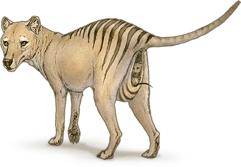 The Thylacine, or Tasmanian tiger, is a large carnivorous marsupial that officially went extinct in 1936. As the only member of the family Thylacinidae to survive into modern times, the sharply-clawed thylacine possessed a lean and athletic appearance with sandy yellowish-brown to gray fur and 15-20 distinct dark stripes across the back from shoulders to tail. Its canid-like skull and large jaws held 46 sharp teeth.