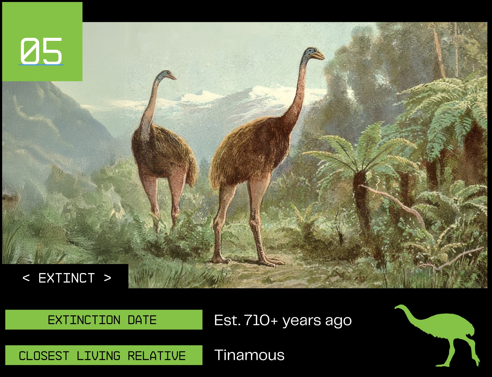 A mysterious giant of equally enigmatic origins, the moa once dominated the forests and plains of New Zealand—existing nowhere else—until it vanished into extinction. By the late 13th century, human activity led to the rapid decline and ultimate disappearance of the moa. Today, Colossal is committed to bringing it back.