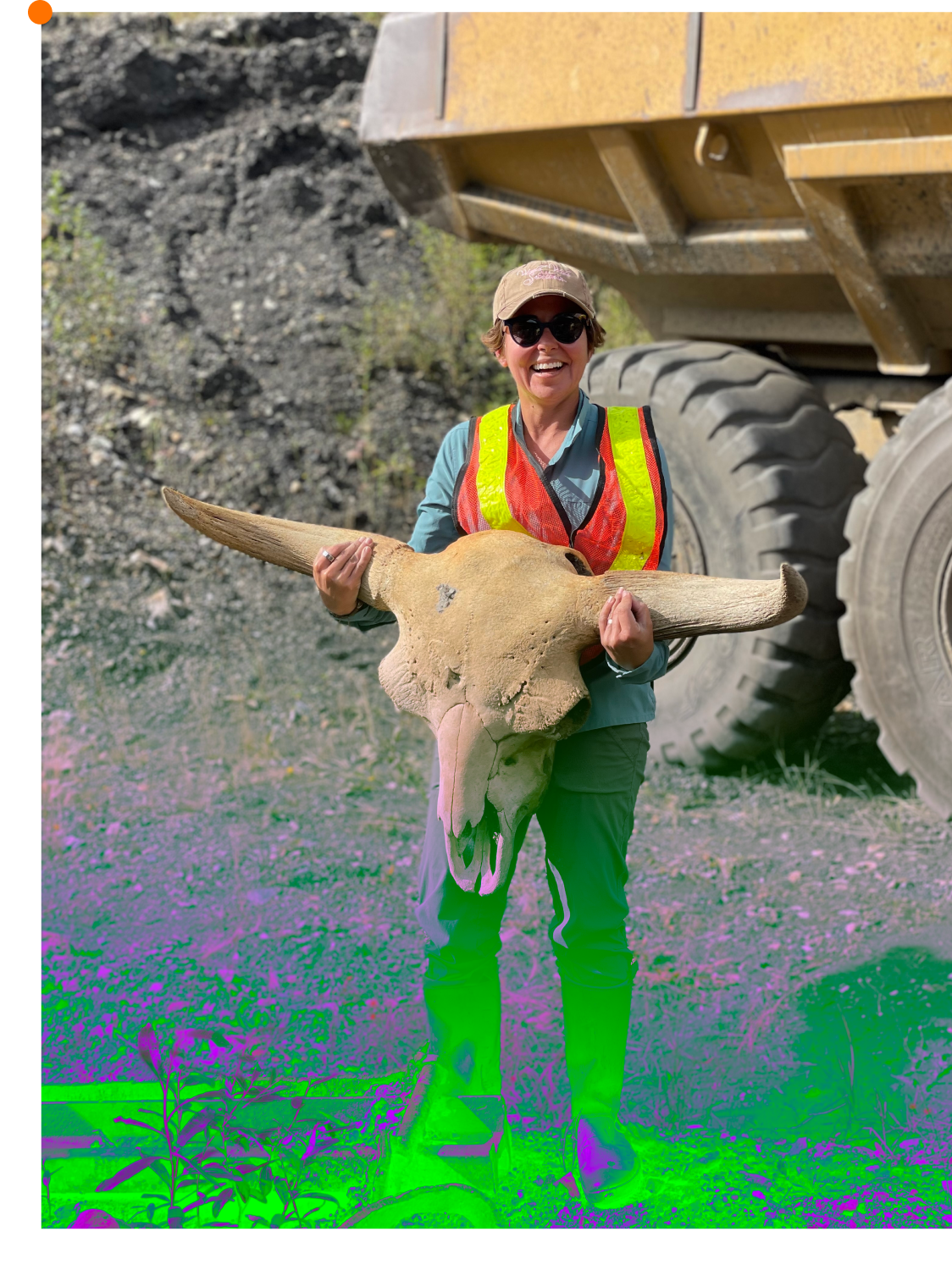 Beth Shapiro, Ph.D. holding a step bison skull recently unearthed by gold miners in the Klondike region of Yukon, Canada.