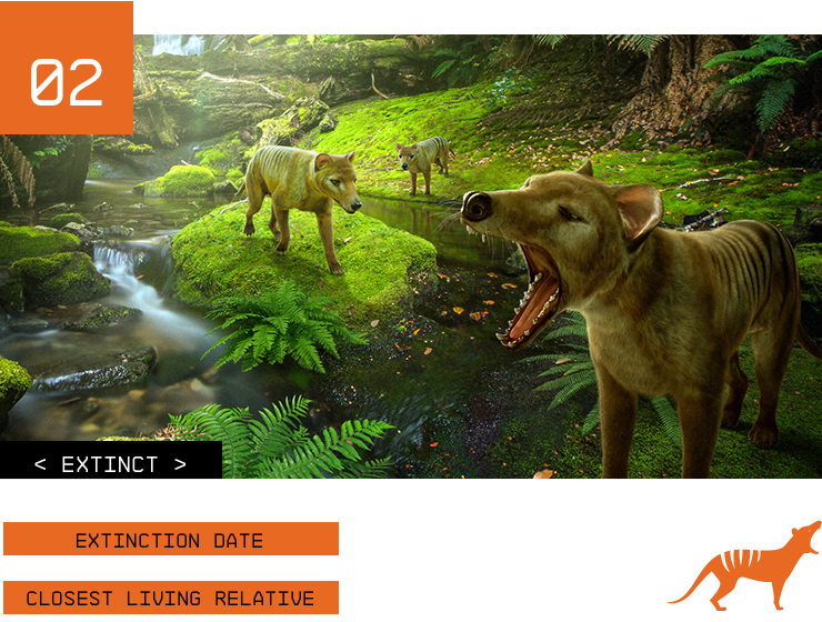 The thylacine, or Tasmanian tiger, is a large carnivorous marsupial that officially went extinct in 1936. As the only member of the family Thylacinidae to survive into modern times, the sharply-clawed thylacine possessed a lean and athletic appearance with sandy yellowish-brown to gray fur and 15-20 distinct dark stripes across the back from shoulders to tail. Its canid-like skull and large jaws held 46 sharp teeth.