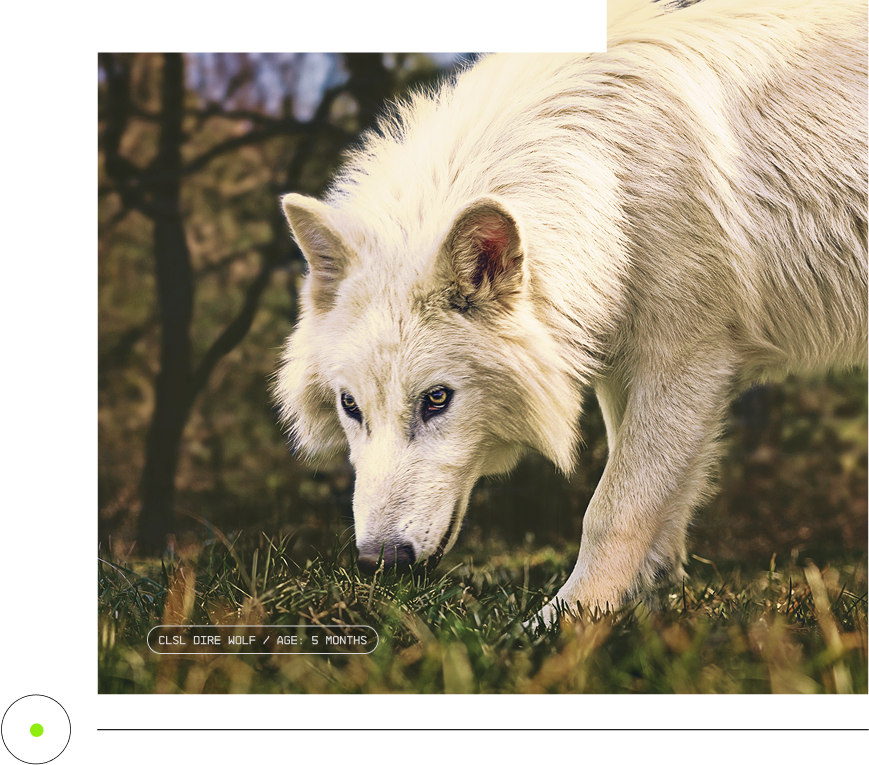 With this latest breakthrough, our team has devoted countless hours and computational horsepower to analyzing the dire wolf genome using Colossal’s proprietary software and algorithms. These advanced scientific and technological methods were designed for the specific purpose of analyzing and comparing ancient DNA. And not only have they allowed our team to uncover key secrets of the majestic dire wolf, but to identify the key gene and regulatory variants needed to resurrect it, as well.