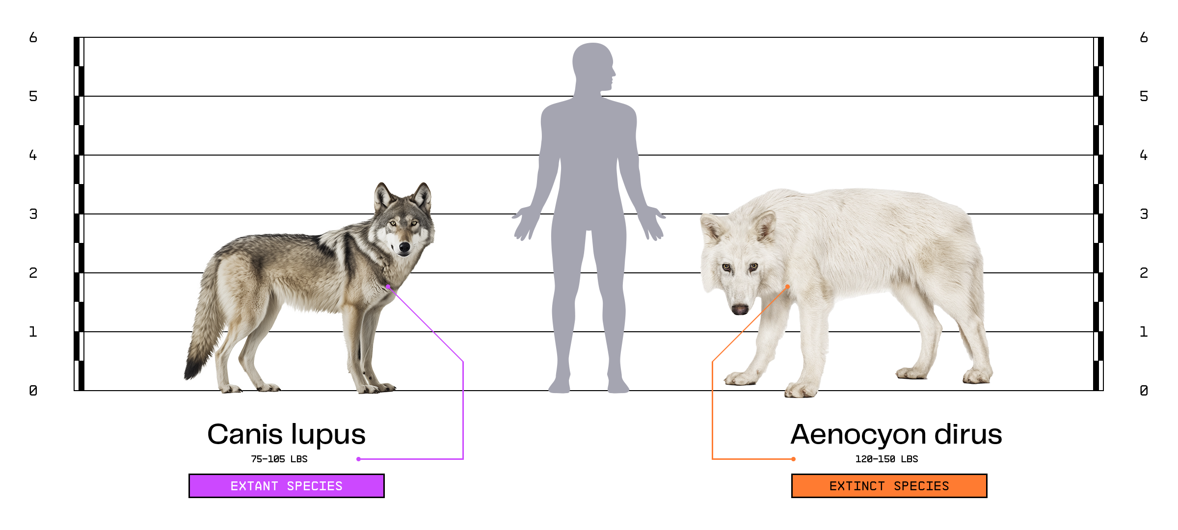 The differences between dire wolves and gray wolves are subtle. At a glance, dire wolves had thicker legs, wider heads, broader shoulders, a more robust musculature, and a fuller snout. Below we can see how they would match up standing next to each other and an average-sized adult male human.