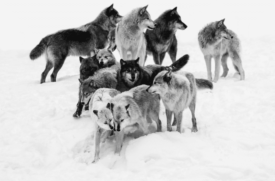 Wolves live in packs. Most packs have four to nine members, but the size can range from as few as two wolves to as many as 15.